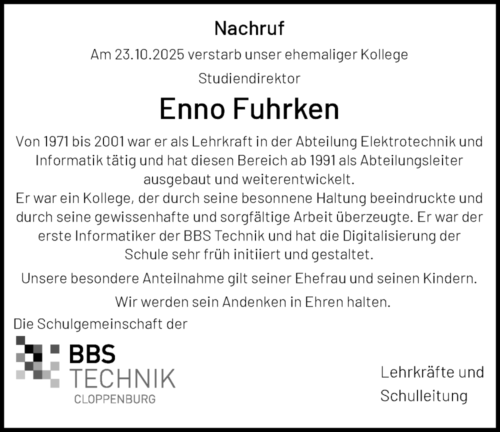 Hier finden Sie alle Traueranzeigen aus der Zeitung, die bisher für Enno Fuhrken erschienen sind. Weitere Traueranzeigen, die in der Zeitung erscheinen, werden hier ebenfalls aufgelistet