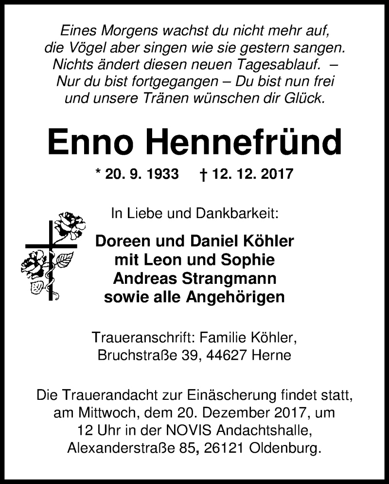Hier finden Sie alle Traueranzeigen aus der Zeitung, die bisher für Enno Hennefründ erschienen sind. Weitere Traueranzeigen, die in der Zeitung erscheinen, werden hier ebenfalls aufgelistet