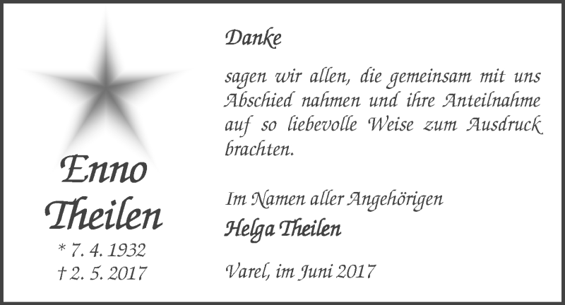 Hier finden Sie alle Traueranzeigen aus der Zeitung, die bisher für Enno Theilen erschienen sind. Weitere Traueranzeigen, die in der Zeitung erscheinen, werden hier ebenfalls aufgelistet