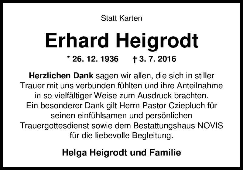 Hier finden Sie alle Traueranzeigen aus der Zeitung, die bisher für Erhard Heigrodt erschienen sind. Weitere Traueranzeigen, die in der Zeitung erscheinen, werden hier ebenfalls aufgelistet