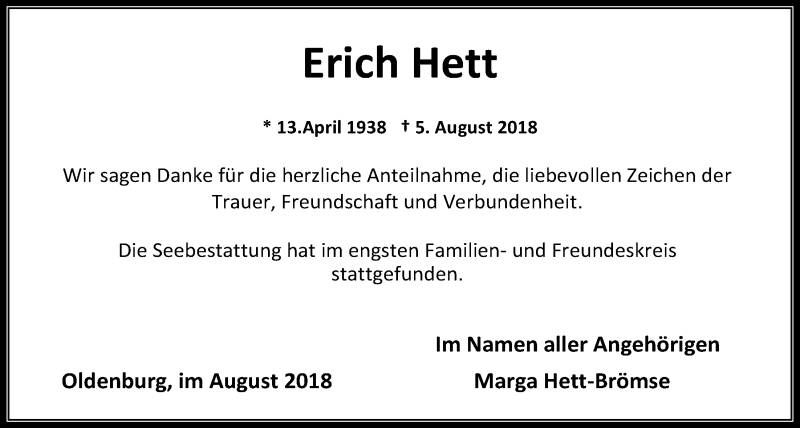 Hier finden Sie alle Traueranzeigen aus der Zeitung, die bisher für Erich Hett erschienen sind. Weitere Traueranzeigen, die in der Zeitung erscheinen, werden hier ebenfalls aufgelistet