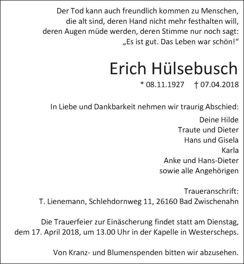 Hier finden Sie alle Traueranzeigen aus der Zeitung, die bisher für Erich Hülsebusch erschienen sind. Weitere Traueranzeigen, die in der Zeitung erscheinen, werden hier ebenfalls aufgelistet