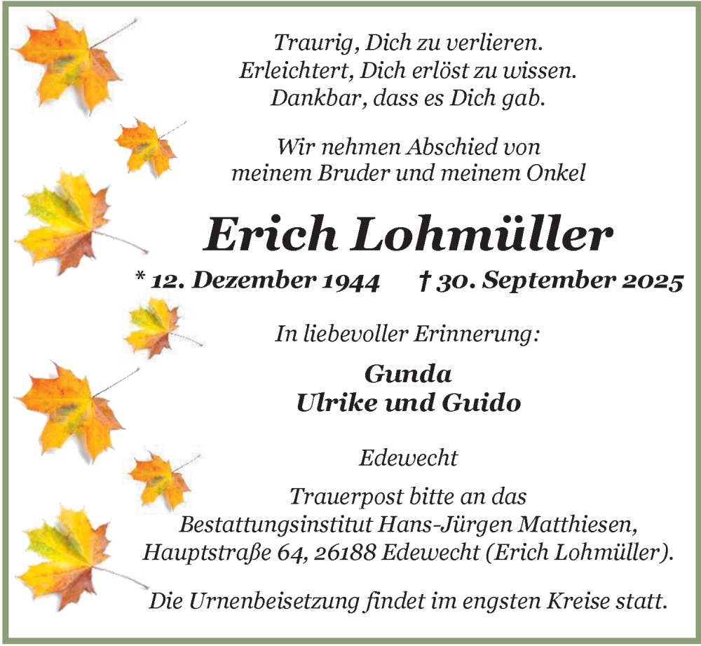 Hier finden Sie alle Traueranzeigen aus der Zeitung, die bisher für Erich Lohmüller erschienen sind. Weitere Traueranzeigen, die in der Zeitung erscheinen, werden hier ebenfalls aufgelistet