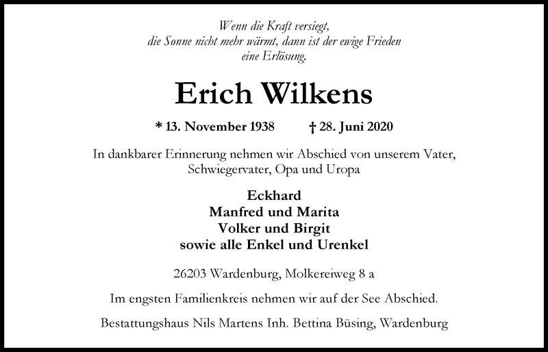 Hier finden Sie alle Traueranzeigen aus der Zeitung, die bisher für Erich Wilkens erschienen sind. Weitere Traueranzeigen, die in der Zeitung erscheinen, werden hier ebenfalls aufgelistet
