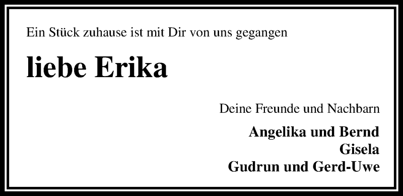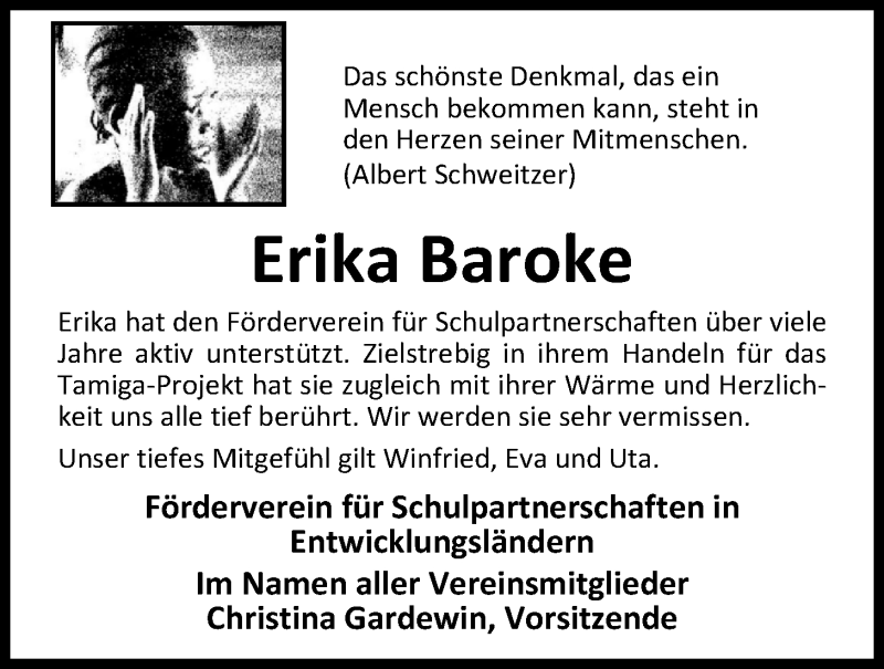 Hier finden Sie alle Traueranzeigen aus der Zeitung, die bisher für Erika Baroke erschienen sind. Weitere Traueranzeigen, die in der Zeitung erscheinen, werden hier ebenfalls aufgelistet