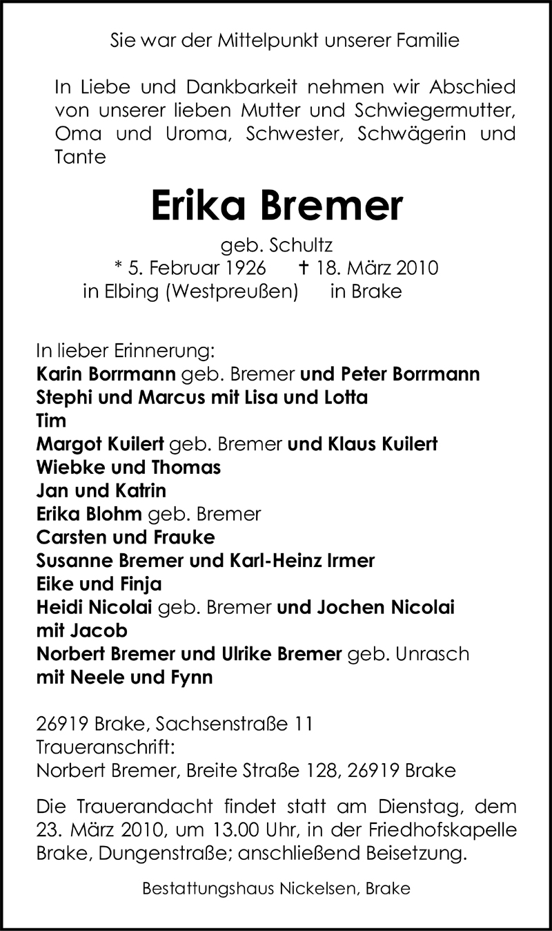 Hier finden Sie alle Traueranzeigen aus der Zeitung, die bisher für Erika Bremer erschienen sind. Weitere Traueranzeigen, die in der Zeitung erscheinen, werden hier ebenfalls aufgelistet