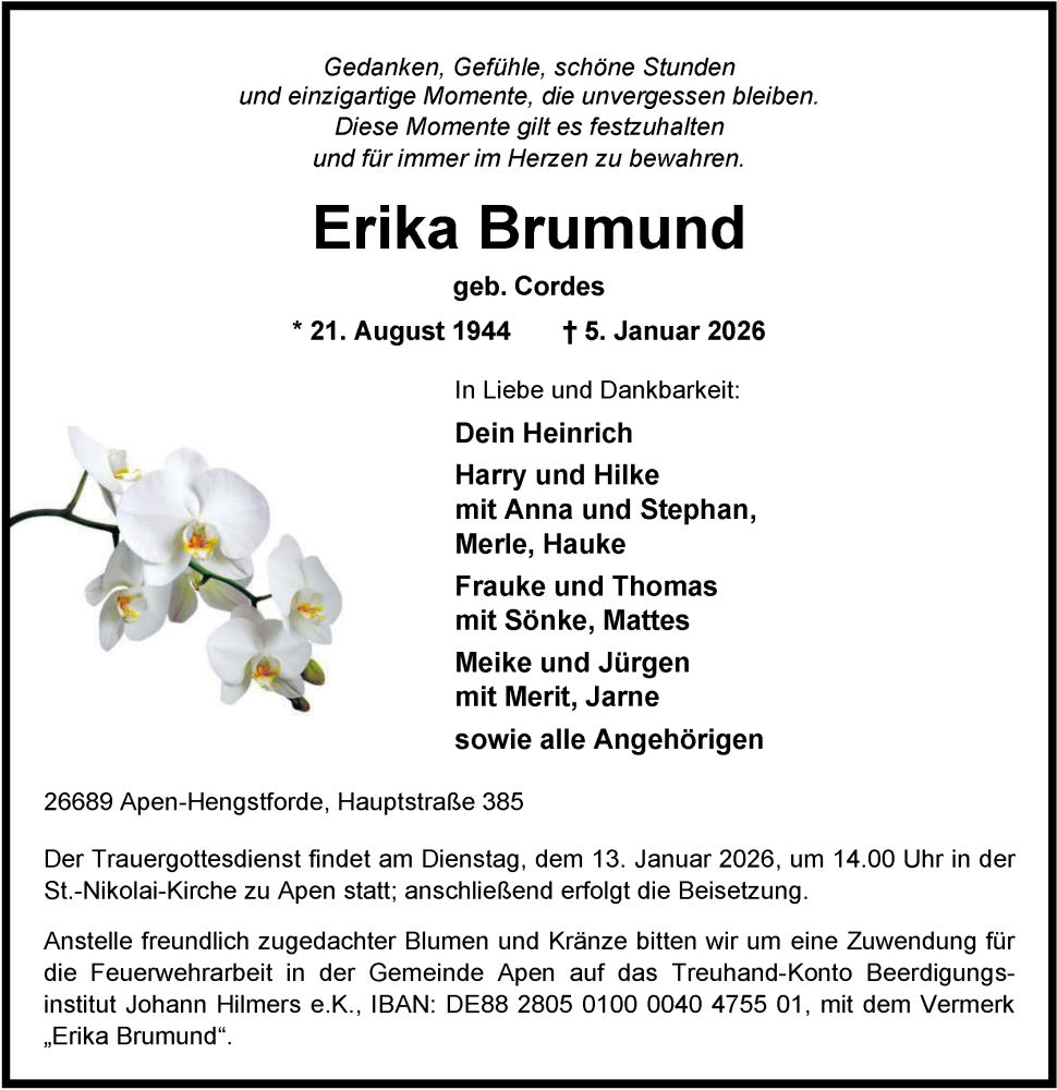 Hier finden Sie alle Traueranzeigen aus der Zeitung, die bisher für Erika Brumund erschienen sind. Weitere Traueranzeigen, die in der Zeitung erscheinen, werden hier ebenfalls aufgelistet