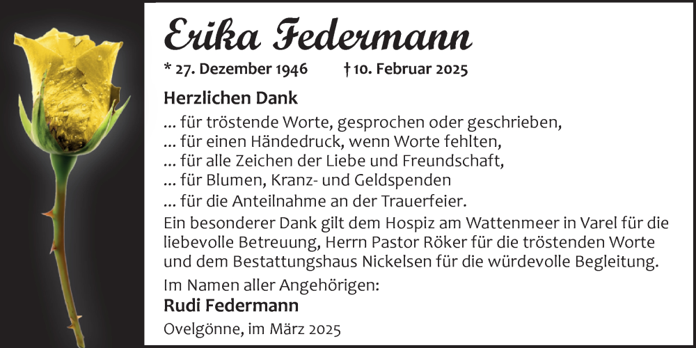 Hier finden Sie alle Traueranzeigen aus der Zeitung, die bisher für Erika Federmann erschienen sind. Weitere Traueranzeigen, die in der Zeitung erscheinen, werden hier ebenfalls aufgelistet
