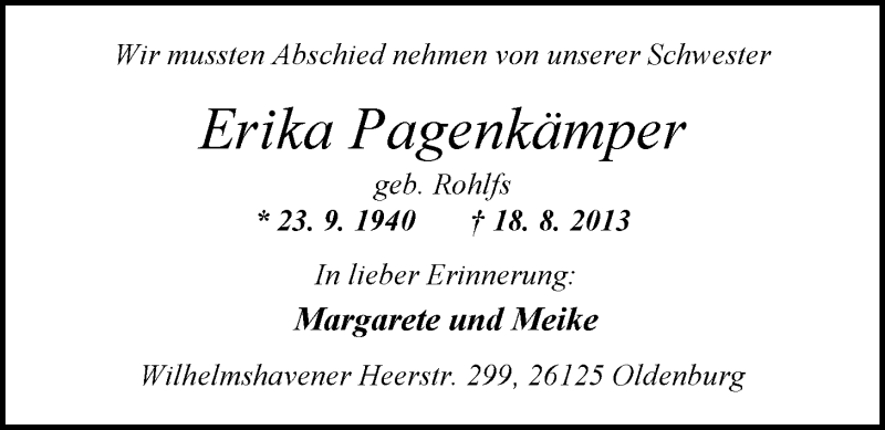 Hier finden Sie alle Traueranzeigen aus der Zeitung, die bisher für Erika Pagenkämper erschienen sind. Weitere Traueranzeigen, die in der Zeitung erscheinen, werden hier ebenfalls aufgelistet