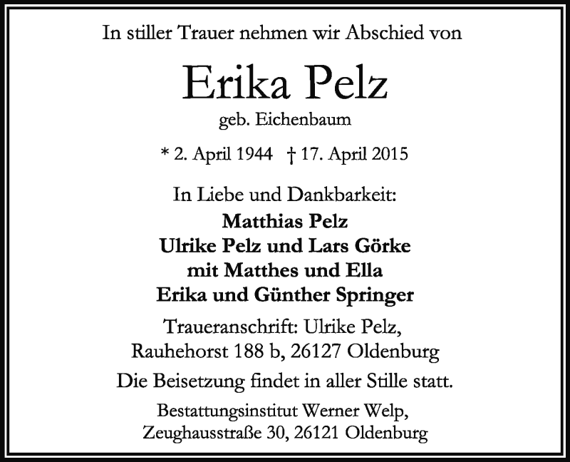 Hier finden Sie alle Traueranzeigen aus der Zeitung, die bisher für Erika Pelz erschienen sind. Weitere Traueranzeigen, die in der Zeitung erscheinen, werden hier ebenfalls aufgelistet