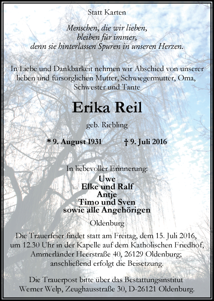 Hier finden Sie alle Traueranzeigen aus der Zeitung, die bisher für Erika Reil erschienen sind. Weitere Traueranzeigen, die in der Zeitung erscheinen, werden hier ebenfalls aufgelistet