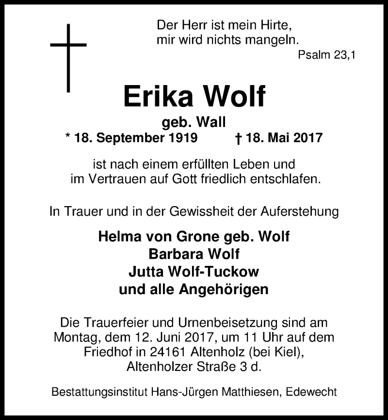 Hier finden Sie alle Traueranzeigen aus der Zeitung, die bisher für Erika Wolf erschienen sind. Weitere Traueranzeigen, die in der Zeitung erscheinen, werden hier ebenfalls aufgelistet