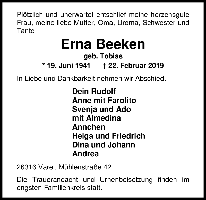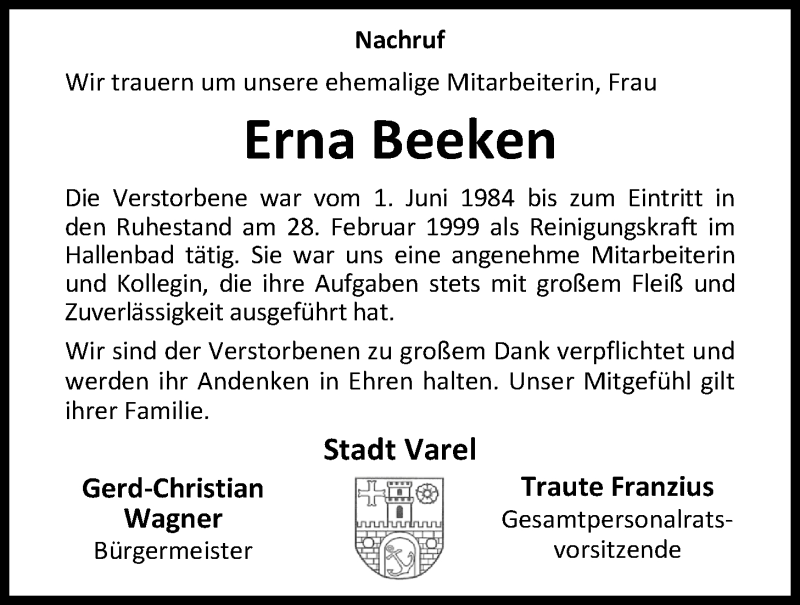 Hier finden Sie alle Traueranzeigen aus der Zeitung, die bisher für Erna Beeken erschienen sind. Weitere Traueranzeigen, die in der Zeitung erscheinen, werden hier ebenfalls aufgelistet