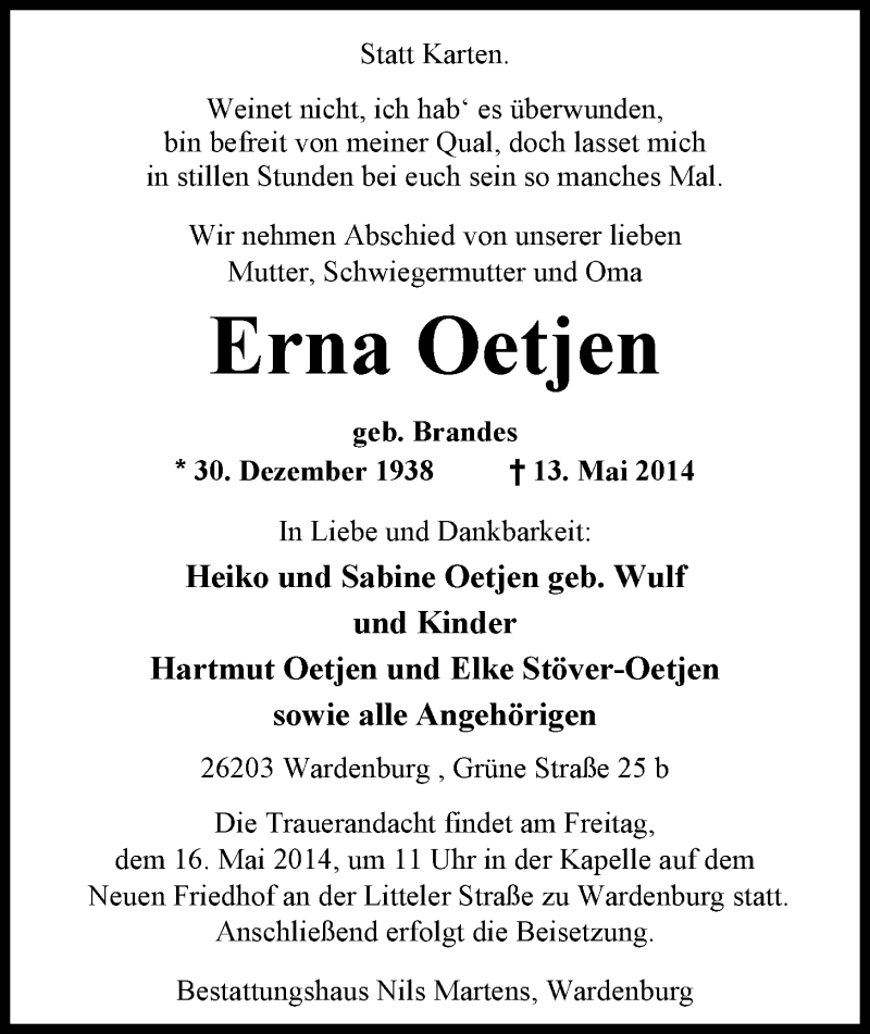 Hier finden Sie alle Traueranzeigen aus der Zeitung, die bisher für Erna Oetjen erschienen sind. Weitere Traueranzeigen, die in der Zeitung erscheinen, werden hier ebenfalls aufgelistet