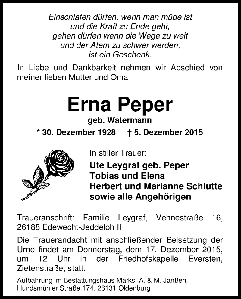 Hier finden Sie alle Traueranzeigen aus der Zeitung, die bisher für Erna Peper erschienen sind. Weitere Traueranzeigen, die in der Zeitung erscheinen, werden hier ebenfalls aufgelistet