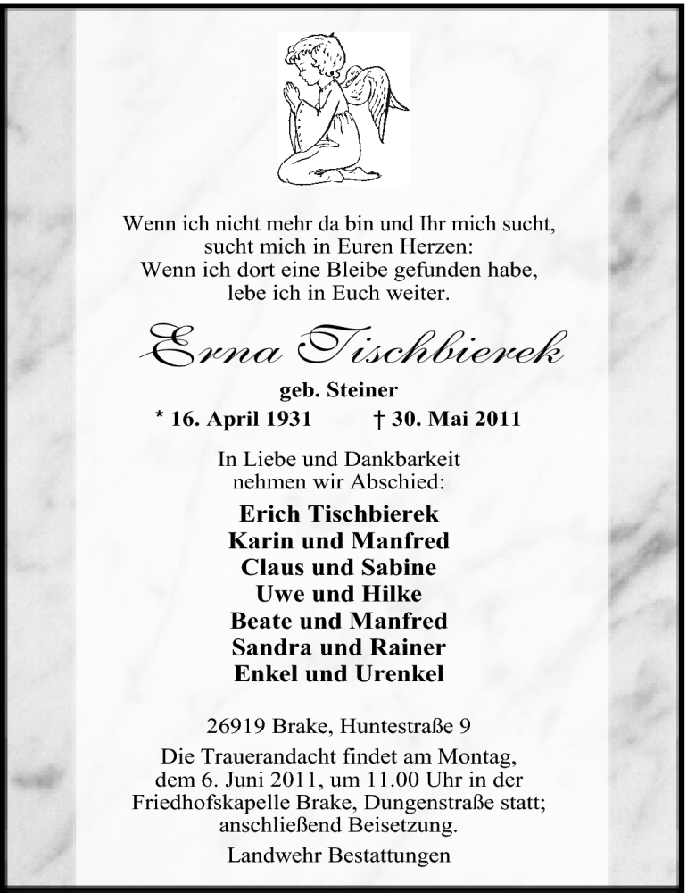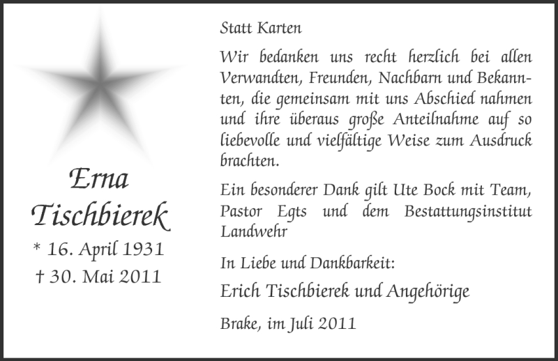 Hier finden Sie alle Traueranzeigen aus der Zeitung, die bisher für Erna Tischbierek erschienen sind. Weitere Traueranzeigen, die in der Zeitung erscheinen, werden hier ebenfalls aufgelistet