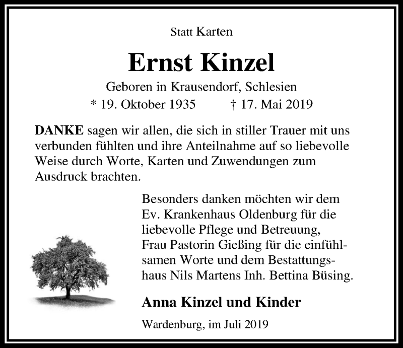 Hier finden Sie alle Traueranzeigen aus der Zeitung, die bisher für Ernst Kinzel erschienen sind. Weitere Traueranzeigen, die in der Zeitung erscheinen, werden hier ebenfalls aufgelistet