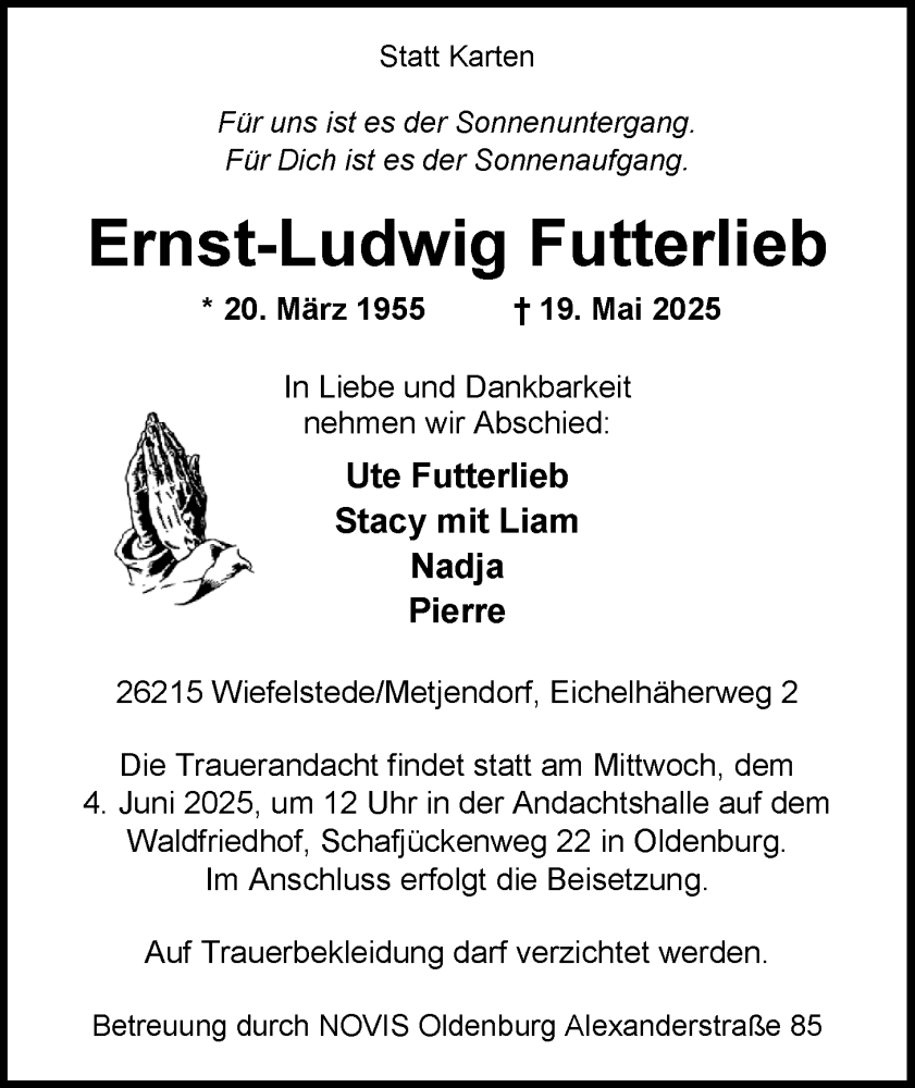 Hier finden Sie alle Traueranzeigen aus der Zeitung, die bisher für Ernst-Ludwig Futterlieb erschienen sind. Weitere Traueranzeigen, die in der Zeitung erscheinen, werden hier ebenfalls aufgelistet