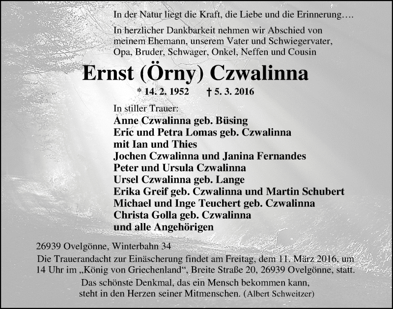 Hier finden Sie alle Traueranzeigen aus der Zeitung, die bisher für Ernst (Örny) Czwalinna erschienen sind. Weitere Traueranzeigen, die in der Zeitung erscheinen, werden hier ebenfalls aufgelistet