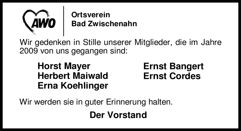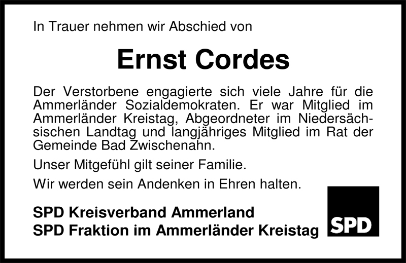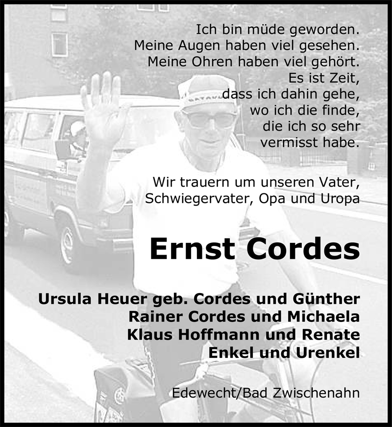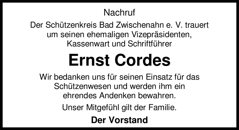 Hier finden Sie alle Traueranzeigen aus der Zeitung, die bisher für Ernst Cordes erschienen sind. Weitere Traueranzeigen, die in der Zeitung erscheinen, werden hier ebenfalls aufgelistet