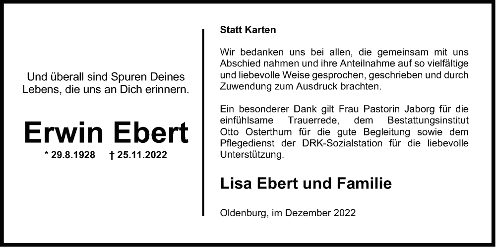 Hier finden Sie alle Traueranzeigen aus der Zeitung, die bisher für Erwin Ebert erschienen sind. Weitere Traueranzeigen, die in der Zeitung erscheinen, werden hier ebenfalls aufgelistet