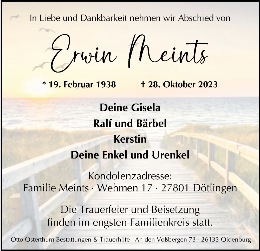 Hier finden Sie alle Traueranzeigen aus der Zeitung, die bisher für Erwin Meints erschienen sind. Weitere Traueranzeigen, die in der Zeitung erscheinen, werden hier ebenfalls aufgelistet