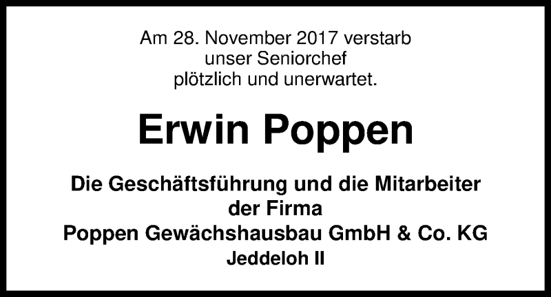 Hier finden Sie alle Traueranzeigen aus der Zeitung, die bisher für Erwin Poppen erschienen sind. Weitere Traueranzeigen, die in der Zeitung erscheinen, werden hier ebenfalls aufgelistet