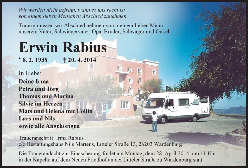 Hier finden Sie alle Traueranzeigen aus der Zeitung, die bisher für Erwin Rabius erschienen sind. Weitere Traueranzeigen, die in der Zeitung erscheinen, werden hier ebenfalls aufgelistet