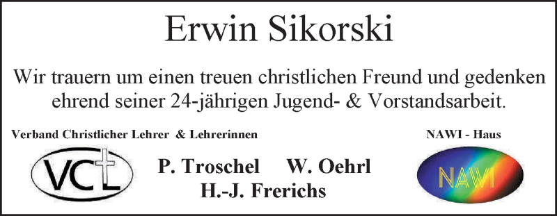 Hier finden Sie alle Traueranzeigen aus der Zeitung, die bisher für Erwin Sikorski erschienen sind. Weitere Traueranzeigen, die in der Zeitung erscheinen, werden hier ebenfalls aufgelistet