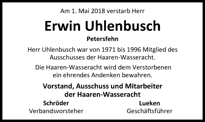 Hier finden Sie alle Traueranzeigen aus der Zeitung, die bisher für Erwin Uhlenbusch erschienen sind. Weitere Traueranzeigen, die in der Zeitung erscheinen, werden hier ebenfalls aufgelistet