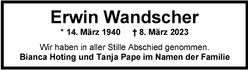 Hier finden Sie alle Traueranzeigen aus der Zeitung, die bisher für Erwin Wandscher erschienen sind. Weitere Traueranzeigen, die in der Zeitung erscheinen, werden hier ebenfalls aufgelistet