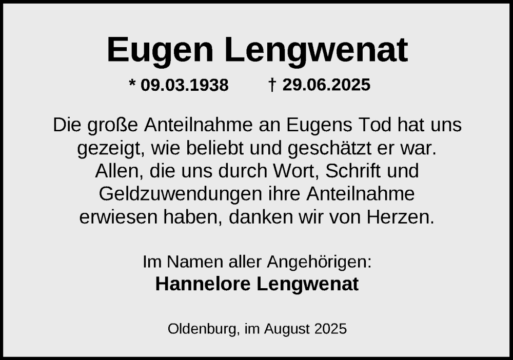 Hier finden Sie alle Traueranzeigen aus der Zeitung, die bisher für Eugen Lengwenat erschienen sind. Weitere Traueranzeigen, die in der Zeitung erscheinen, werden hier ebenfalls aufgelistet