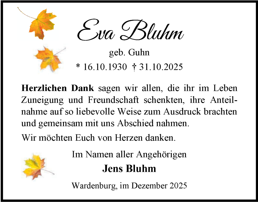 Hier finden Sie alle Traueranzeigen aus der Zeitung, die bisher für Eva Bluhm erschienen sind. Weitere Traueranzeigen, die in der Zeitung erscheinen, werden hier ebenfalls aufgelistet