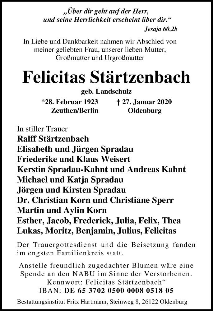 Hier finden Sie alle Traueranzeigen aus der Zeitung, die bisher für Felicitas Stärtzenbach erschienen sind. Weitere Traueranzeigen, die in der Zeitung erscheinen, werden hier ebenfalls aufgelistet