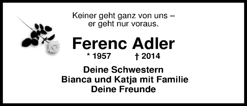 Hier finden Sie alle Traueranzeigen aus der Zeitung, die bisher für Ferenc Adler erschienen sind. Weitere Traueranzeigen, die in der Zeitung erscheinen, werden hier ebenfalls aufgelistet