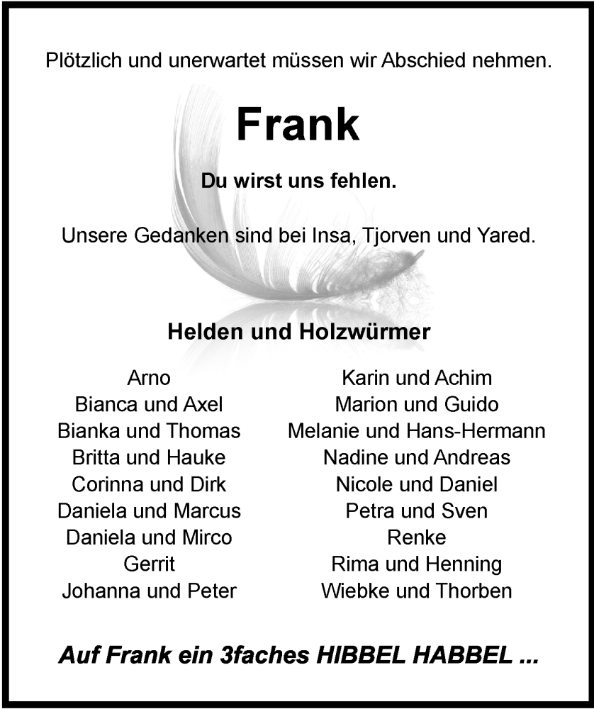 Hier finden Sie alle Traueranzeigen aus der Zeitung, die bisher für Frank erschienen sind. Weitere Traueranzeigen, die in der Zeitung erscheinen, werden hier ebenfalls aufgelistet