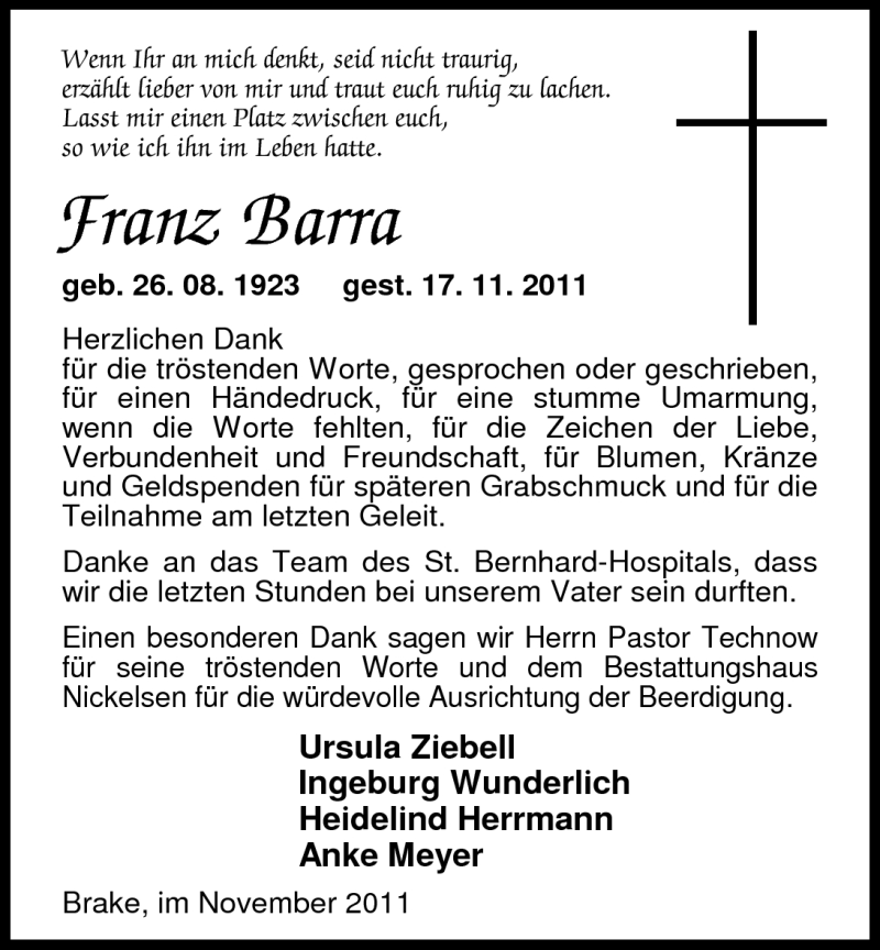 Hier finden Sie alle Traueranzeigen aus der Zeitung, die bisher für Franz Barra erschienen sind. Weitere Traueranzeigen, die in der Zeitung erscheinen, werden hier ebenfalls aufgelistet