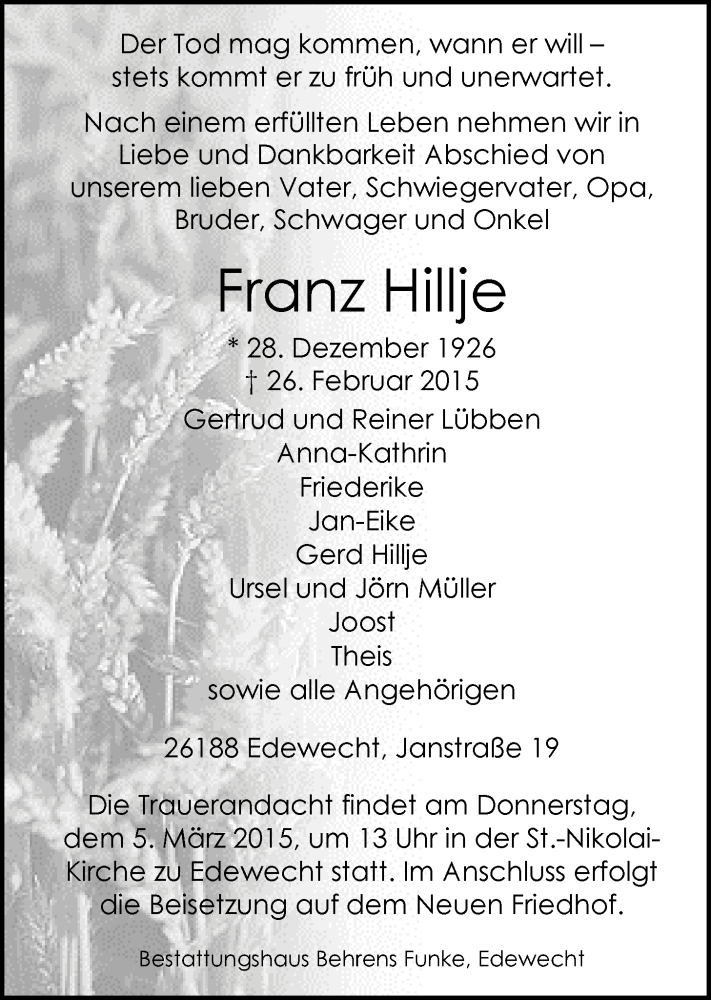 Hier finden Sie alle Traueranzeigen aus der Zeitung, die bisher für Franz Hillje erschienen sind. Weitere Traueranzeigen, die in der Zeitung erscheinen, werden hier ebenfalls aufgelistet