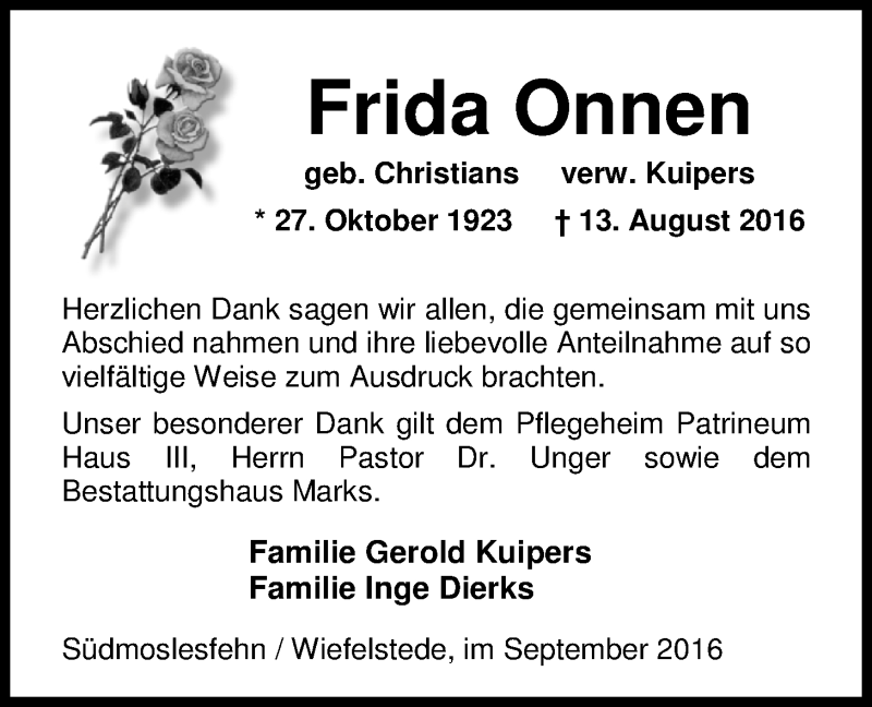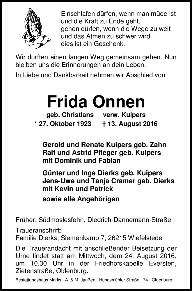 Hier finden Sie alle Traueranzeigen aus der Zeitung, die bisher für Frida Onnen erschienen sind. Weitere Traueranzeigen, die in der Zeitung erscheinen, werden hier ebenfalls aufgelistet