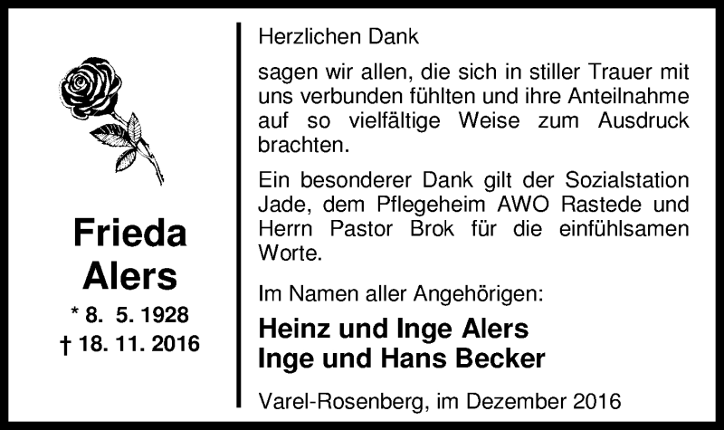 Hier finden Sie alle Traueranzeigen aus der Zeitung, die bisher für Frieda Alers erschienen sind. Weitere Traueranzeigen, die in der Zeitung erscheinen, werden hier ebenfalls aufgelistet