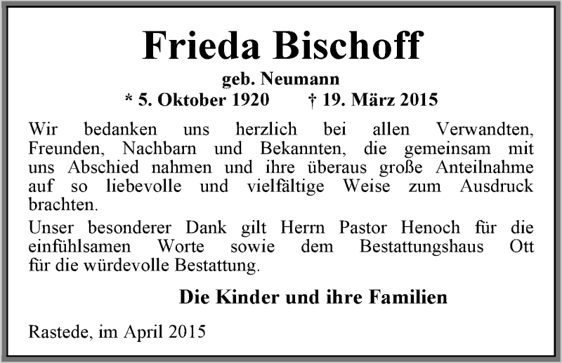 Hier finden Sie alle Traueranzeigen aus der Zeitung, die bisher für Frieda Bischoff erschienen sind. Weitere Traueranzeigen, die in der Zeitung erscheinen, werden hier ebenfalls aufgelistet