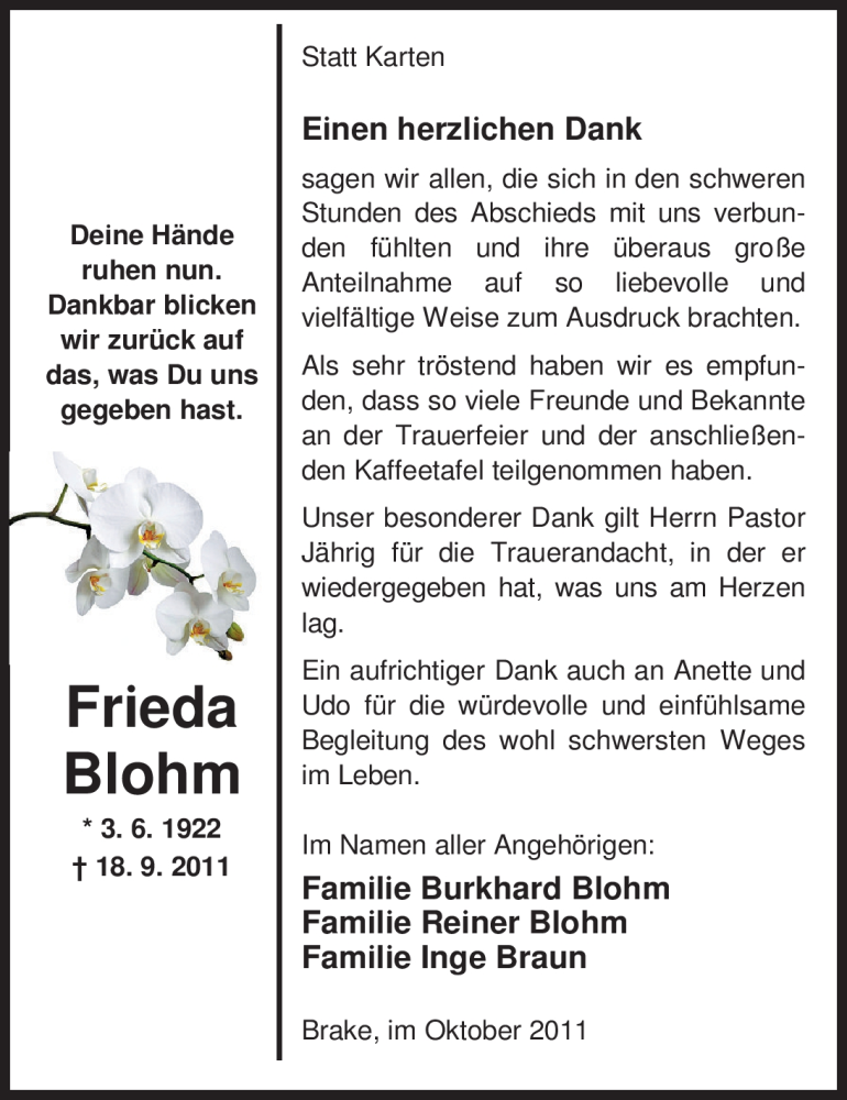 Hier finden Sie alle Traueranzeigen aus der Zeitung, die bisher für Frieda Blohm erschienen sind. Weitere Traueranzeigen, die in der Zeitung erscheinen, werden hier ebenfalls aufgelistet