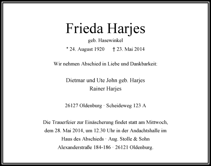 Hier finden Sie alle Traueranzeigen aus der Zeitung, die bisher für Frieda Harjes erschienen sind. Weitere Traueranzeigen, die in der Zeitung erscheinen, werden hier ebenfalls aufgelistet