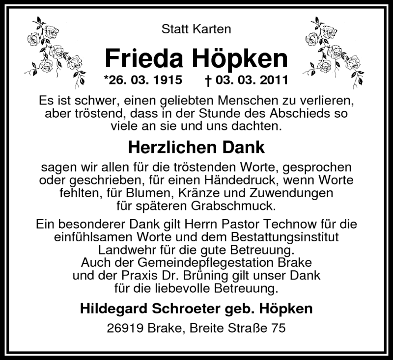 Hier finden Sie alle Traueranzeigen aus der Zeitung, die bisher für Frieda Höpken erschienen sind. Weitere Traueranzeigen, die in der Zeitung erscheinen, werden hier ebenfalls aufgelistet