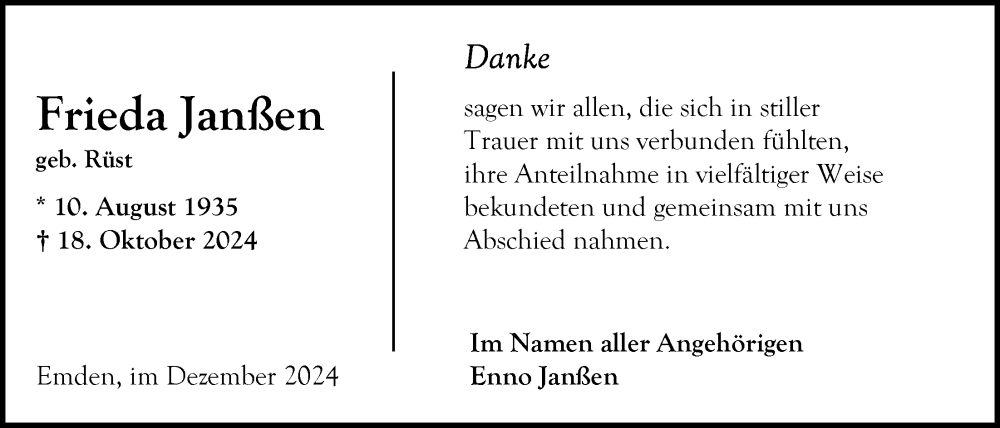 Hier finden Sie alle Traueranzeigen aus der Zeitung, die bisher für Frieda Janßen erschienen sind. Weitere Traueranzeigen, die in der Zeitung erscheinen, werden hier ebenfalls aufgelistet