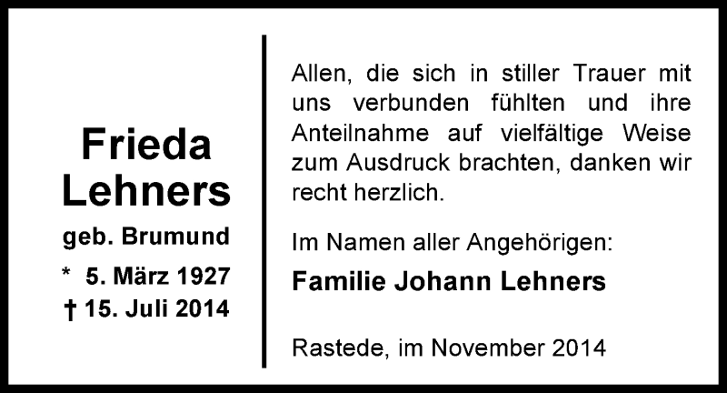 Hier finden Sie alle Traueranzeigen aus der Zeitung, die bisher für Frieda Lehners erschienen sind. Weitere Traueranzeigen, die in der Zeitung erscheinen, werden hier ebenfalls aufgelistet