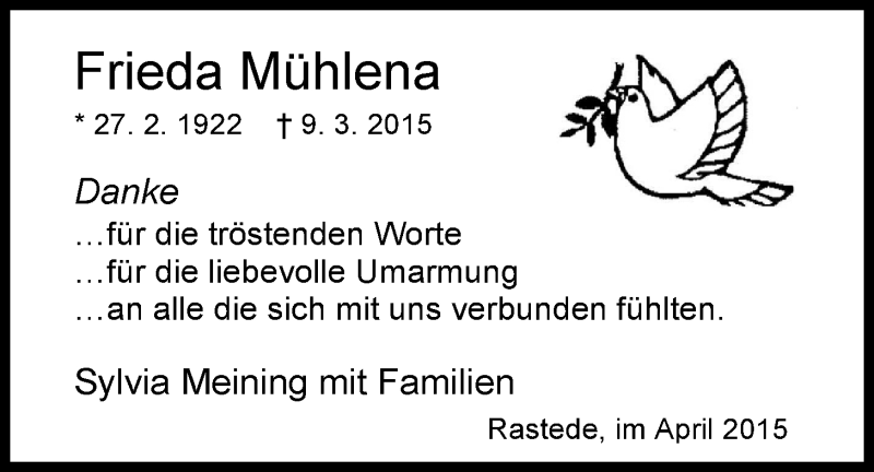 Hier finden Sie alle Traueranzeigen aus der Zeitung, die bisher für Frieda Mühlena erschienen sind. Weitere Traueranzeigen, die in der Zeitung erscheinen, werden hier ebenfalls aufgelistet
