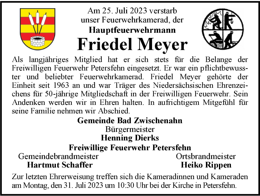 Hier finden Sie alle Traueranzeigen aus der Zeitung, die bisher für Friedel Meyer erschienen sind. Weitere Traueranzeigen, die in der Zeitung erscheinen, werden hier ebenfalls aufgelistet