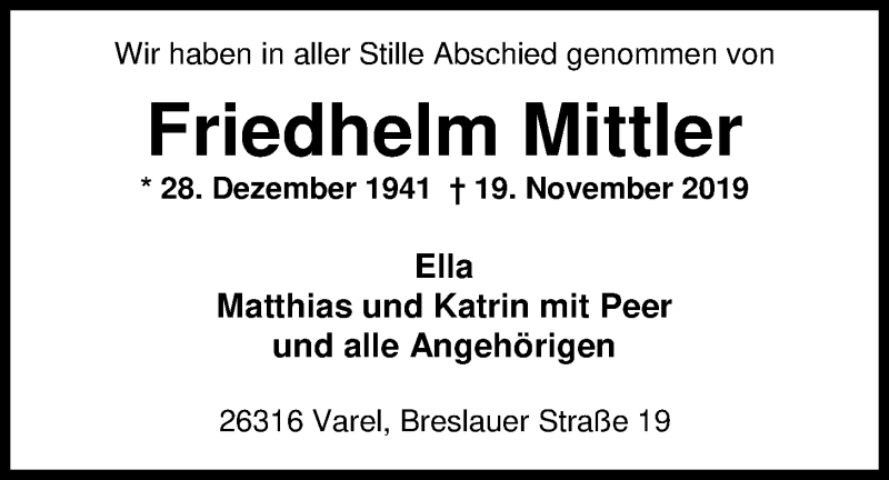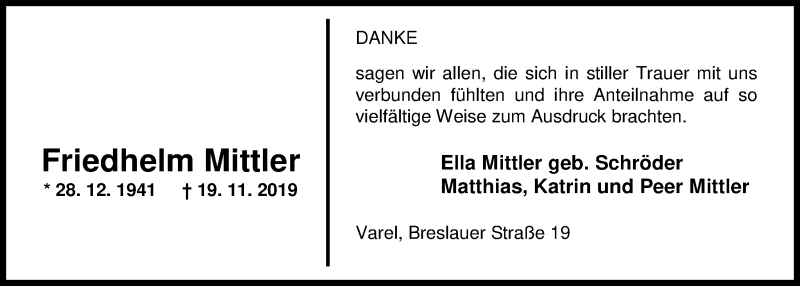 Hier finden Sie alle Traueranzeigen aus der Zeitung, die bisher für Friedhelm Mittler erschienen sind. Weitere Traueranzeigen, die in der Zeitung erscheinen, werden hier ebenfalls aufgelistet