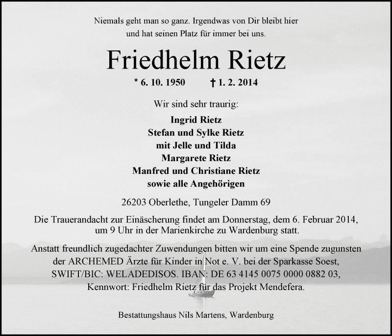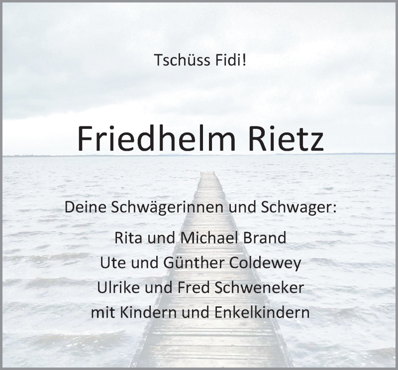 Hier finden Sie alle Traueranzeigen aus der Zeitung, die bisher für Friedhelm Rietz erschienen sind. Weitere Traueranzeigen, die in der Zeitung erscheinen, werden hier ebenfalls aufgelistet